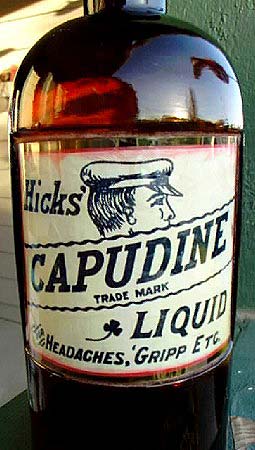 At right, Jack Murdock shows an amber Hicks Capudine bottle from Raleigh with original label and original glass dose cap - first time anyone has seen the dose cap.