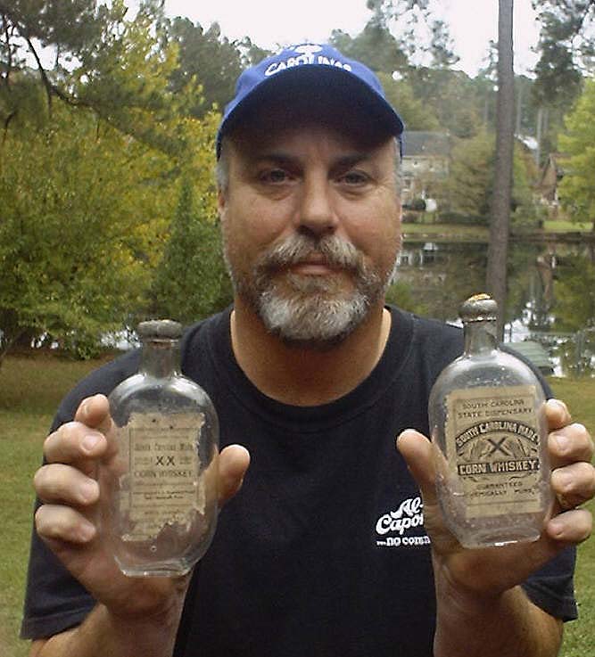 I moved on down the wall a couple feet and POW! Right there is a half pint jo-jo SC Dispensary monogram laying there. I grabbed the bottle and jumped up with my head making a dent in a two by eight board that was part of the ceiling. I had the bottle in one hand, my eyes closed rubbing my head with the other hand. After sitting there a minute or two I regained my composure. I told myself, "Let�s try not to do that again." I moved on down the wall and believe it or not there was another one. I looked up to gauge the ceiling and started salivating. I grabbed the bottle and blew the dust off of it and saw a full label. I could not believe it and tried to stand up for some stupid reason. WHAM!