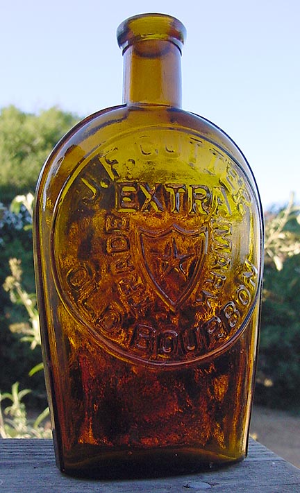 Golden amber flask embossed J. F. CUTTER / EXTRA / TRADE MARK / OLD BOURBON with shield and star sold on eBay by leisalu for $1250. Blown in 1870s at San Francisco Glass Works. |